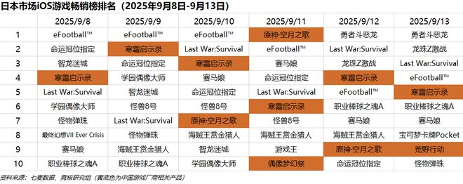 日本市场2025年9月8日-2025年9月13日iOS游戏类畅销榜中,米哈游《原神·空月之歌》登顶1天。点点互动《寒霜启示录》、网易《荒野行动》、乐元素《偶像梦幻祭》等进入畅销榜前十。