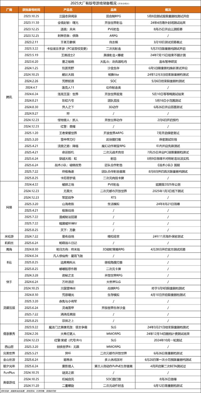网易方面大约有8款,包括《无限大》《山海奇旅》《极限战场》《天下:万象》等。此外,米哈游、鹰角、莉莉丝、西山居各有1款,B站、快手、儒意景秀3款,灵犀互娱5款,英雄游戏、完美世界等也有1到3款有版号的在研项目。