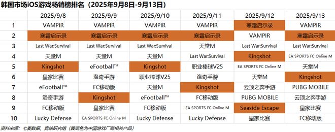 韩国市场2025年9月8日-2025年9月13日iOS游戏类畅销榜中,点点互动《寒霜启示录》登顶1天。点点互动《Kingshot》、柠檬微趣《Seaside Escape》等产品进入畅销榜Top10。