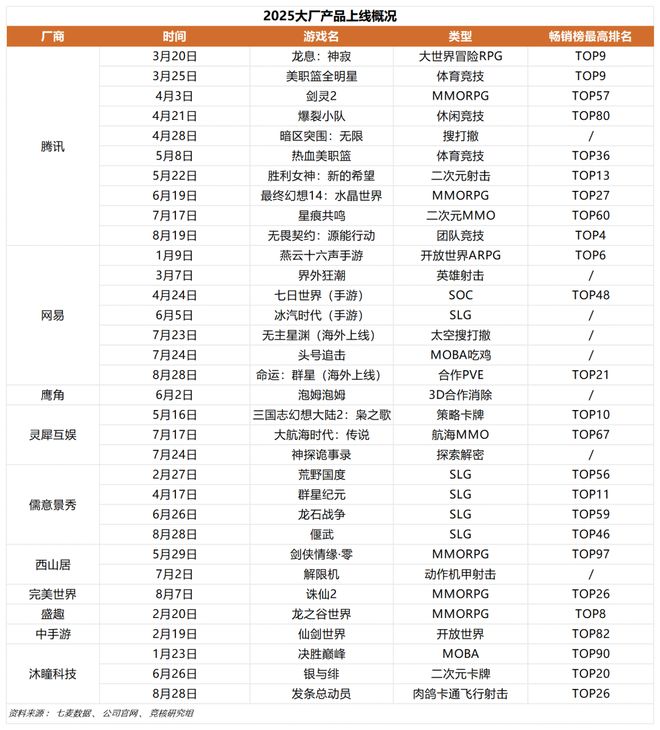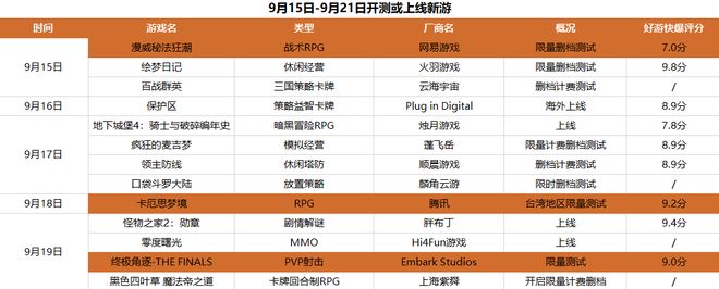 产品上新方面,截至9月14日,腾讯、网易分别上线款产品,儒意景秀上线款,沐瞳、灵犀互娱上线款,中手游、盛趣、鹰角各上线一款游戏。