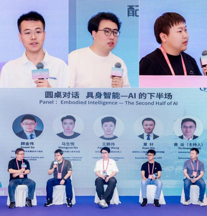 在本场论坛中,围绕“具身智能:AI的下半场”主题还进行了一场圆桌对话。在 Roboraction.AI CEO黄浴的主持下,本场圆桌对话汇聚了NVIDIA资深研究员兼技术小组长顾金伟、宇树科技机器人技术总监马生悦、BAAI 具身智能大模型负责人王鹏伟,以及深圳市人工智能与机器人研究院副研究员夏轩,他们从算法到硬件、从模型到场景,共同探讨了具身智能的发展机遇与技术挑战。