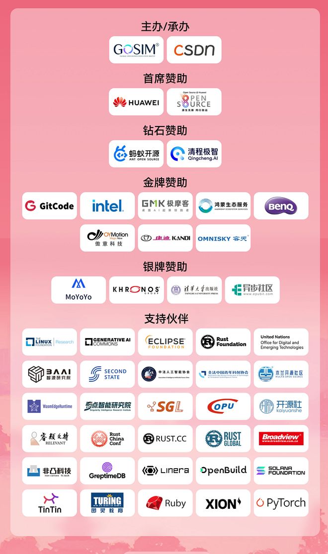 大会的顺利举办离不开众多合作伙伴的大力支持。在此,我们特别感谢华为、蚂蚁开源、清程极智、GitCode、GMKtec、鸿蒙生态服务公司、明基编程显示器、上海傲意信息科技有限公司、康迪科技、北京容天汇海科技有限公司、模优优、khronos、清华大学出版社、人民邮电出版社异步社区对大会的支持与信任。正是有了你们的共同参与与贡献,今天的大会才能如此精彩纷呈。