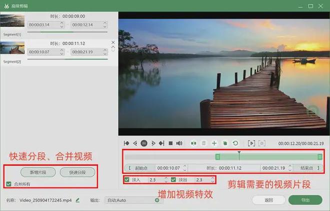 步骤3:当屏幕内容录制结束并停止后,不用切换其他工具,数据蛙录屏软件自带的“高级剪辑”功能就能满足后续编辑需求。通过该工具,用户可以将长视频分割为多个短视频片段、为视频添加转场特效等,进一步优化录制成果。