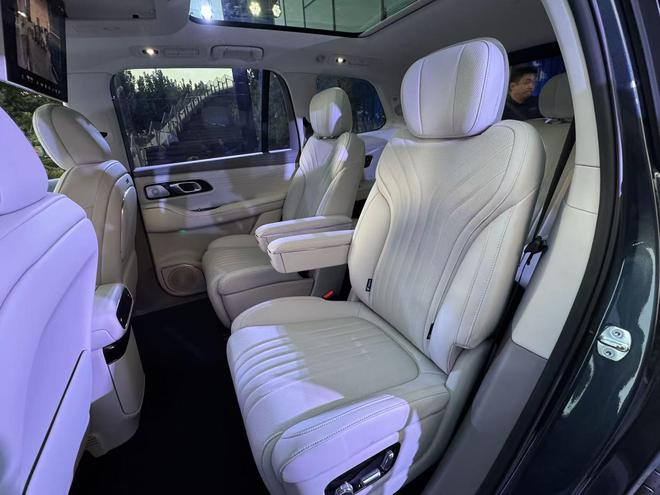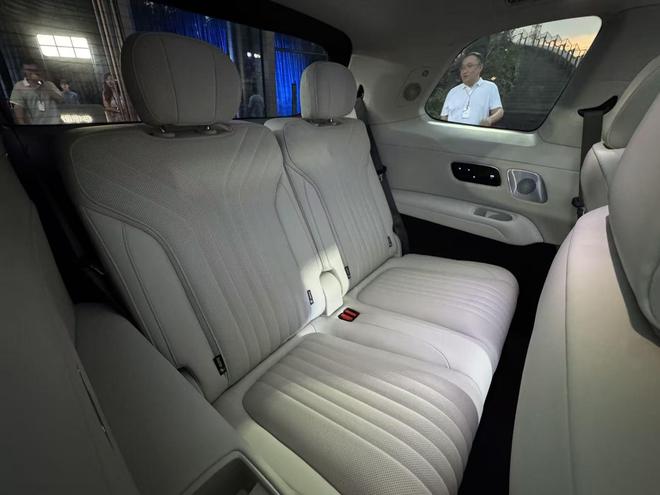第三排,座椅更大躺倒角度达150°,乘坐宽度1070mm,头部空间970mm,坐垫长度510mm,靠背高度637mm,舒适体验媲美前排。0.15平米的超大“三排舷窗”让视野更加开阔,加上独立充电口等配置,为乘客带来自在惬意的乘坐感受。