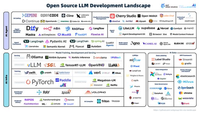 报告最初起源于蚂蚁集团内部的技术趋势洞察,其中的数据全部来源于开源社区,通过对 GitHub 全平台项目的分析,使用 OpenRank 算法对项目进行筛选和排名。本次发布的大模型开源开发生态全景图共收录了分布在 22 个技术领域的 114 个最受关注的开源项目,分为 AI Agent 和 AI Infra 两大技术方向。