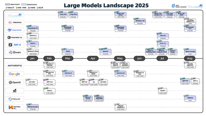 蚂蚁开源在论坛上同步发布 2025 大模型发展时间线全景图。该全景图梳理了 2025 年1月至今国内外主流厂商的大模型发布时间线,包含开放参数的模型和闭源模型。全景图内标注了模型参数、模态等关键信息,为开发者和社区理解当下各家厂商的激烈竞争提供参考。