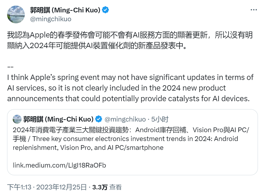 今日,天风国际分析师郭明錤于社交平台X发布2024年消费电子产业三大关键投资趋势预测:安卓库存回补、Vision Pro、AI PC与手机。其中提到,2024年AI装置的主流硬件规格将包括内建7-10B大模型、40-50TOPS的AI算力、10-20 Tokens/s或以上的推理速度、8-16GB或以上的DRAM等。随后他转发称,认为苹果的春季发布会可能不会有AI服务方面的显著更新,所以没有明显纳入2024年可能提供AI装置催化剂的新产品发表中。