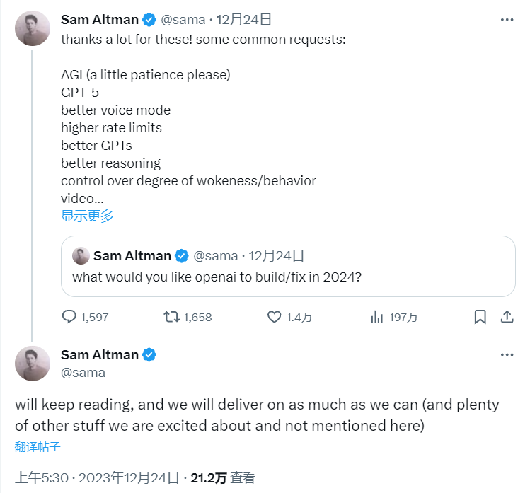 12月24日,OpenAI CEO萨姆·阿尔特曼(Sam Altman)于社交平台X上发帖询问网友对于OpenAI明年应该建设或修复哪些功能的建议,随后他总结了一些常见的请求,包括AGI、GPT-5、更好的语音模式、更高的速率限制、更好的GPTs、更好的推理、控制行为的程度、视频功能、个性化、更好的浏览、使用OpenAI登录、开源等。其中,他在AGI后面标注“请耐心等待”,并称“对于AGI的请求比预期多得多,但很抱歉,我认为我们无法在2024年实现这一目标”,他还提到将“尽可能满足这些需求,以及许多其他未被网友提及、但令OpenAI团队自己感到兴奋的功能”。