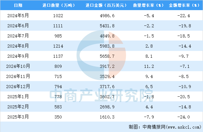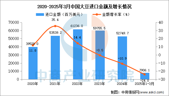 从金额方面来看,数据显示,2025年1-3月中国大豆进口金额7906.1百万美元,同比下降24%。